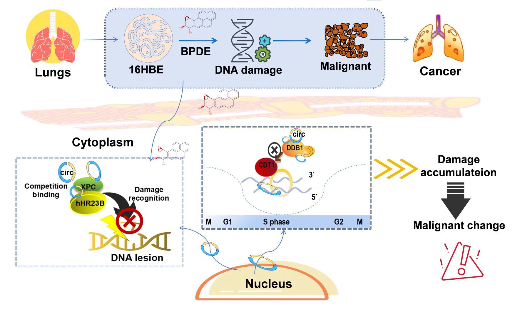 研究团队自2020年始,在国家自然科学基金重点项目资助下,以环境中广泛存在的环境化学污染物苯并[a]芘为代表,从细胞实验、动物模型及临床肺癌样本等多层面开展研究,揭示了表观遗传物质非编码RNA在化学致癌中的重要作用。研究发现环状非编码RNA circ_0004470可以调控化学物诱导的DNA损伤,揭示了细胞内表观遗传和遗传学物质可相互作用的事实。进一步的探索,发现circ_0004470通过协同影响DNA损伤和细胞周期这一双重作用模式驱动肺癌的发生。该研究创新性地阐明了化学致癌中遗传学和表观遗传相互作用的新机制,为环境相关肺癌的精准防控和临床诊治提供了原创性的新靶点。