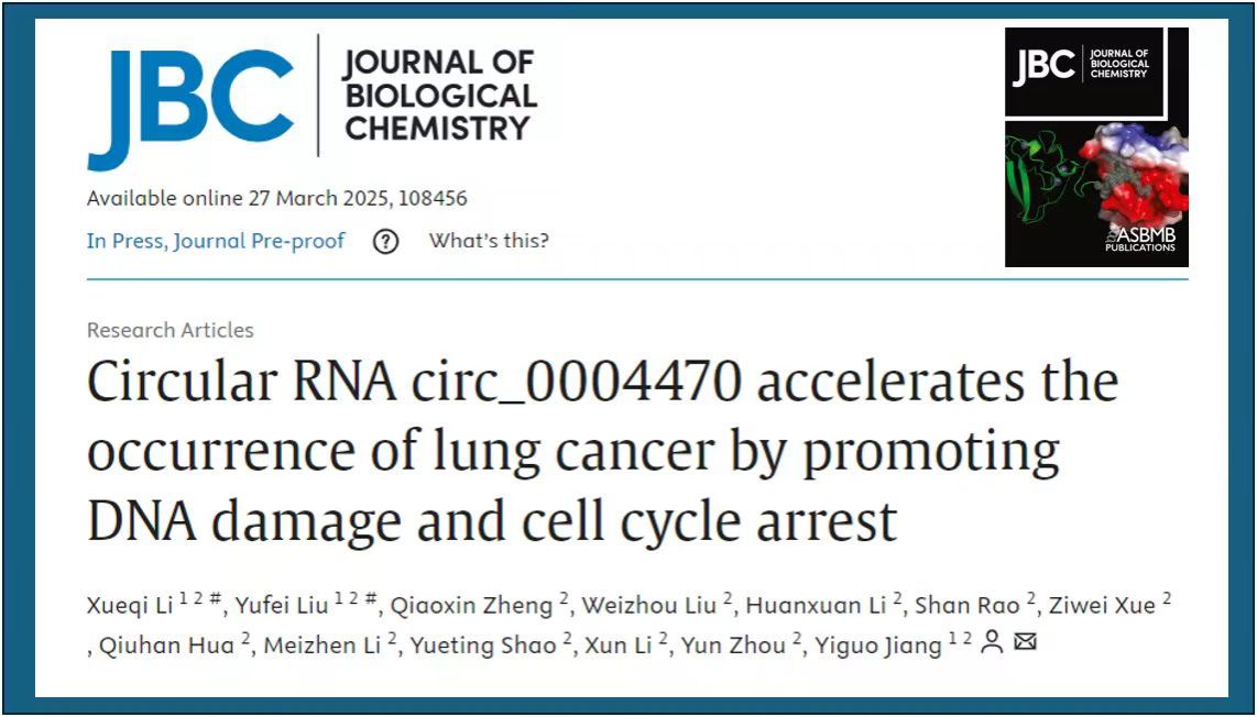 本网讯 3月27日,生物化学领域国际权威杂志Journal of Biological Chemistry在线发表了best365公共卫生学院蒋义国教授团队的化学致癌机制研究原创论文Circular RNA circ_0004470 accelerates the occurrence of lung cancer by promoting DNA damage and cell cycle arrest。