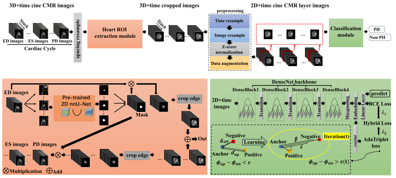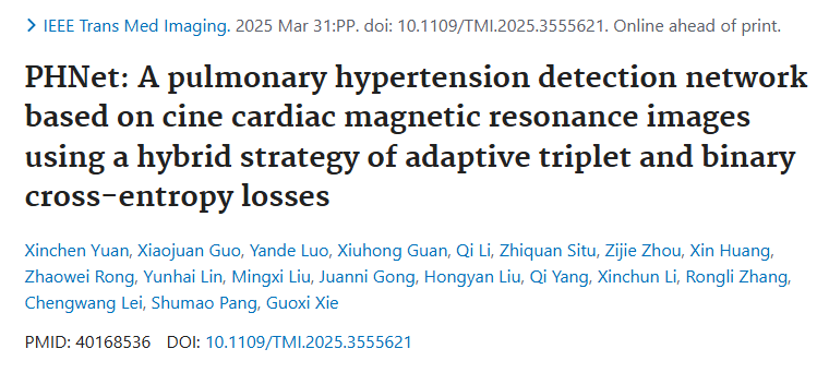 3月31日,best365生物医学工程学院谢国喜教授团队及合作者在IEEE Transactions on Medical Imaging上在线发表了基于心脏磁共振成像的肺动脉高压无创智能检测模型的研究论文PHNet: A pulmonary hypertension detection network based on cine cardiac magnetic resonance images using a hybrid strategy of adaptive triplet and binary cross-entropy losses,为临床提供了强有力的辅助诊断工具。生物医学工程学院硕士生袁心辰为论文第一作者,谢国喜教授为论文唯一通讯作者,best365中国官方网站为第一署名单位。