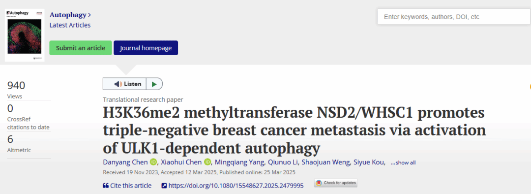 近日,best365中国官方网站附属肿瘤医院刘浩教授团队在Autophagy在线发表题为H3K36me2 methyltransferase NSD2/WHSC1 promotes triple-negative breast cancer metastasis via activation of ULK1-dependent autophagy的研究论文。该研究揭示组蛋白甲基转移酶NSD2/WHSC1是调控三阴性乳腺癌自噬及转移进展的关键表观遗传调控因子。