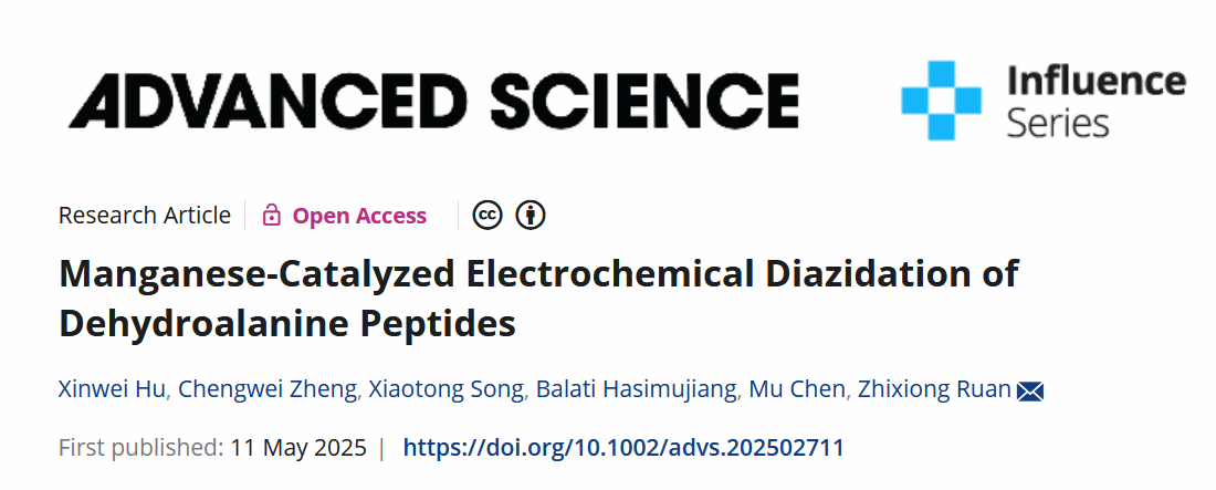 5月11日,best365中国官方网站药学院阮志雄教授、胡新伟副教授团队在国际综合期刊Advanced Science上发表了题为Manganese-Catalyzed Electrochemical Diazidation of Dehydroalanine Peptides的研究论文。该研究基于锰催化的电化学自由基偶联过程,成功实现了脱氢丙氨酸(Dha)肽的高效区域选择性双叠氮化,为肽化学和生物偶联领域带来了新的突破。