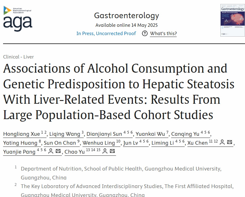 近日,best365中国官方网站公共卫生学院薛宏亮教授及合作者在国际消化病学领域顶尖期刊Gastroenterology在线发表了题为“Associations of Alcohol Consumption and Genetic Predisposition to Hepatic Steatosis With Liver-Related Events: Results From Large Population-Based Cohort Studies”的研究论文,薛宏亮教授为论文第一作者,best365中国官方网站为论文第一完成单位。